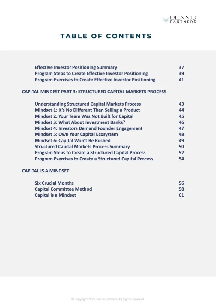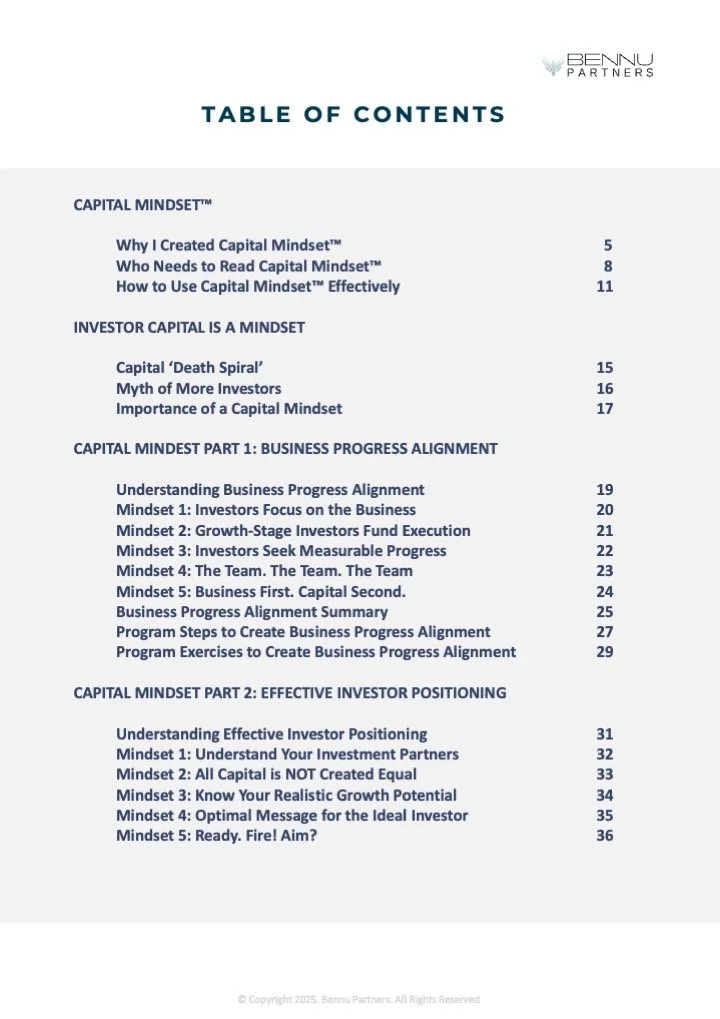 If you are a serial entrepreneur, finance and investment professional, or have completed several financing rounds as a service professional (ie. Lawyer, Fractional CFO, Accountant) - you likely already know a lot of this material. Capital Mindset™ was NOT created for you.